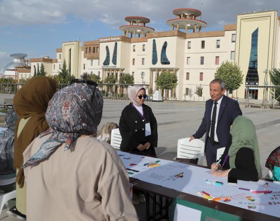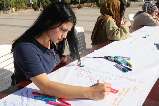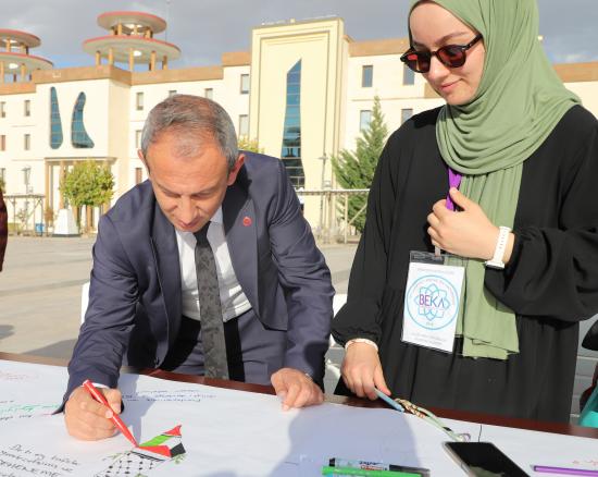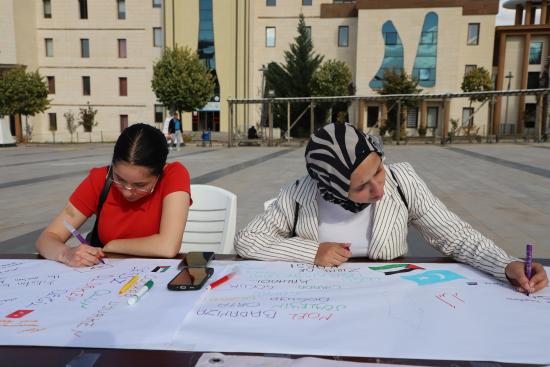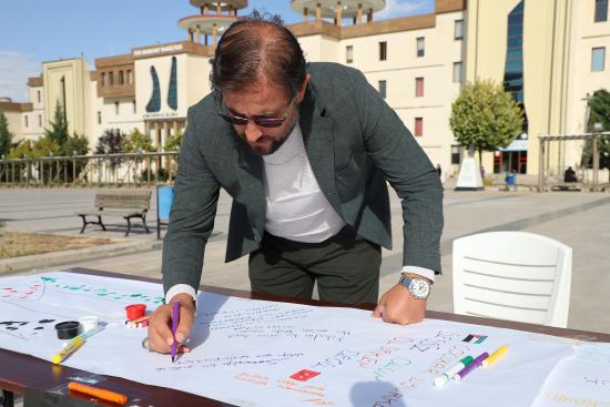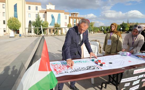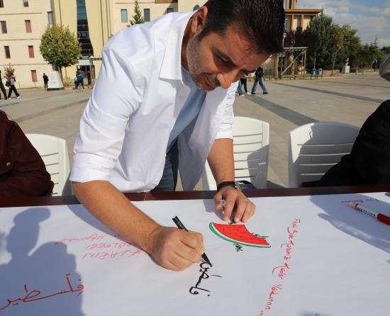 Etkinlikte öğrenciler ve üniversite personeli ayrıca çizim ve mesajlarla Gazze’ye insani koridor açılması, zulme sessiz kalınmaması ve uluslararası toplumun harekete geçmesi gerektiğini vurguladı.